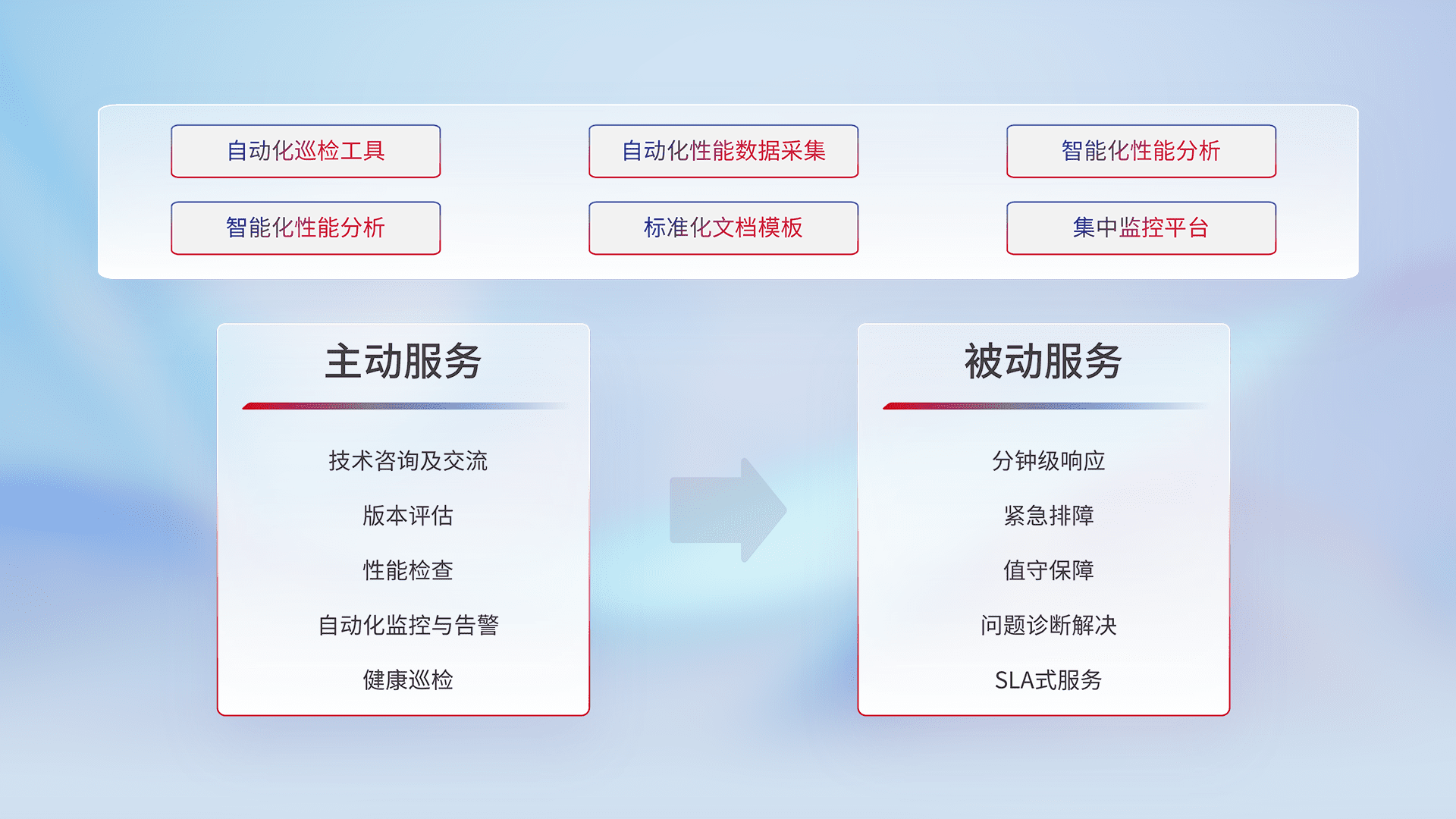 智能化工具和标准化文档,,保障服务质量,,提供主动服务(包含技术咨询、、、版本评估、、性能检查、、、自动化监控与告警、、、健康巡检)和被动服务包含(分钟级响应、、、紧急排障、、、值守保障、、、、问题诊断解决、、、、SLA服务)。。。